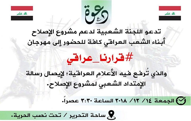 وذكرت اللجنة المقربة من اليتار الصدري في دعوة اليوم (13 كانون الاول 2018)، ان "اللجنة الشعبية لدعم مشروع الاصلاح تدعو ابناء الشعب العراقي كافة للحضور الى مهرجان قرارنا عراقي والذي ترفع فيه الاعلام العراقية".