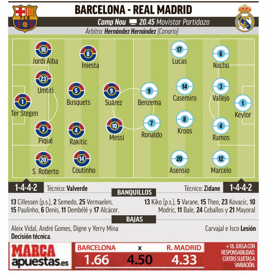 من جانبها كشفت صحيفة "ماركا" الإسبانية عن التشكيلة المتوقعة للكلاسيكو، حيث من المتوقع أن يخوض البرسا صاحب الأرض اللقاء بالتشكيل التالي: