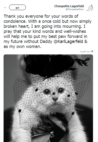 وكتبت القطة عبر حسابها على تويتر، كلمات رثاء لصاحبها، وجاء في تدوينتها: "شكرا للجميع على كلمات التعزية، ولكن الآن أنا مكسورة القلب، سأذهب للحداد وأدعو أن تساعدني كلماتكم ورغباتكم الطيبة في وضع مستقبل أفضل وأن أسير للأمام بدون كارل لاجرفيلد".